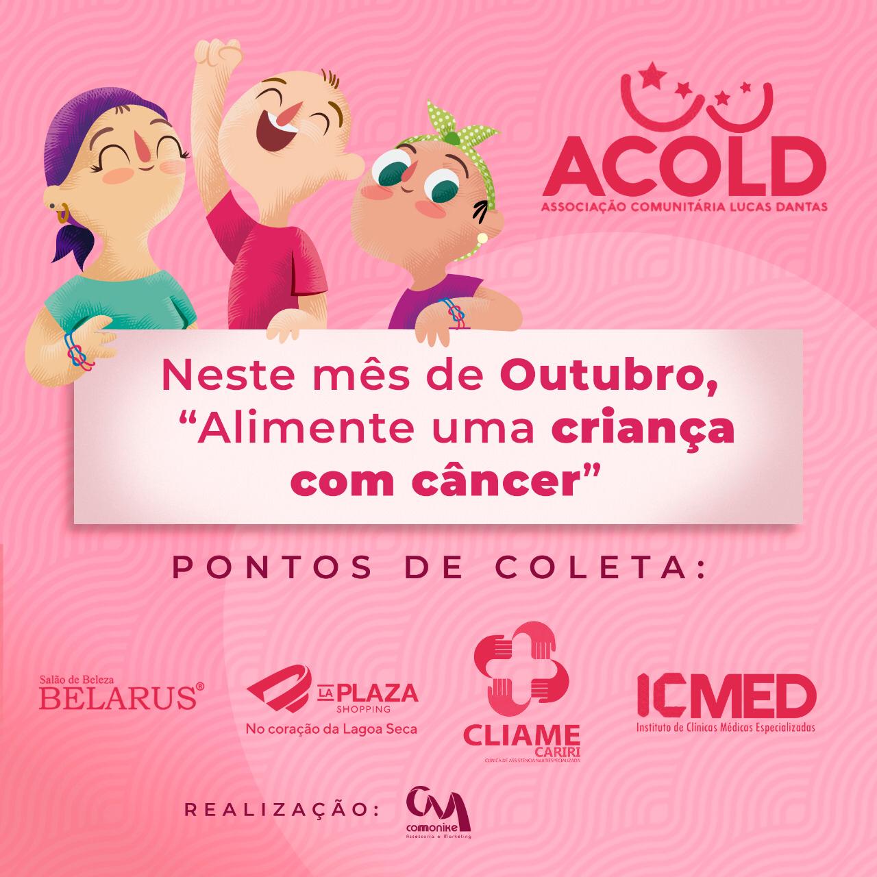 A Associação Comunitária Lucas Dantas- ACOLD, está realizando a campanha “Alimente uma criança com Câncer” que tem como objetivo arrecadar alimentos para essas famílias do Lar Acold, algumas ainda recebem cestas básicas mensais porque os pais dos pacientes acabaram deixando emprego para se dedicar ao tratamento dos filhos.
